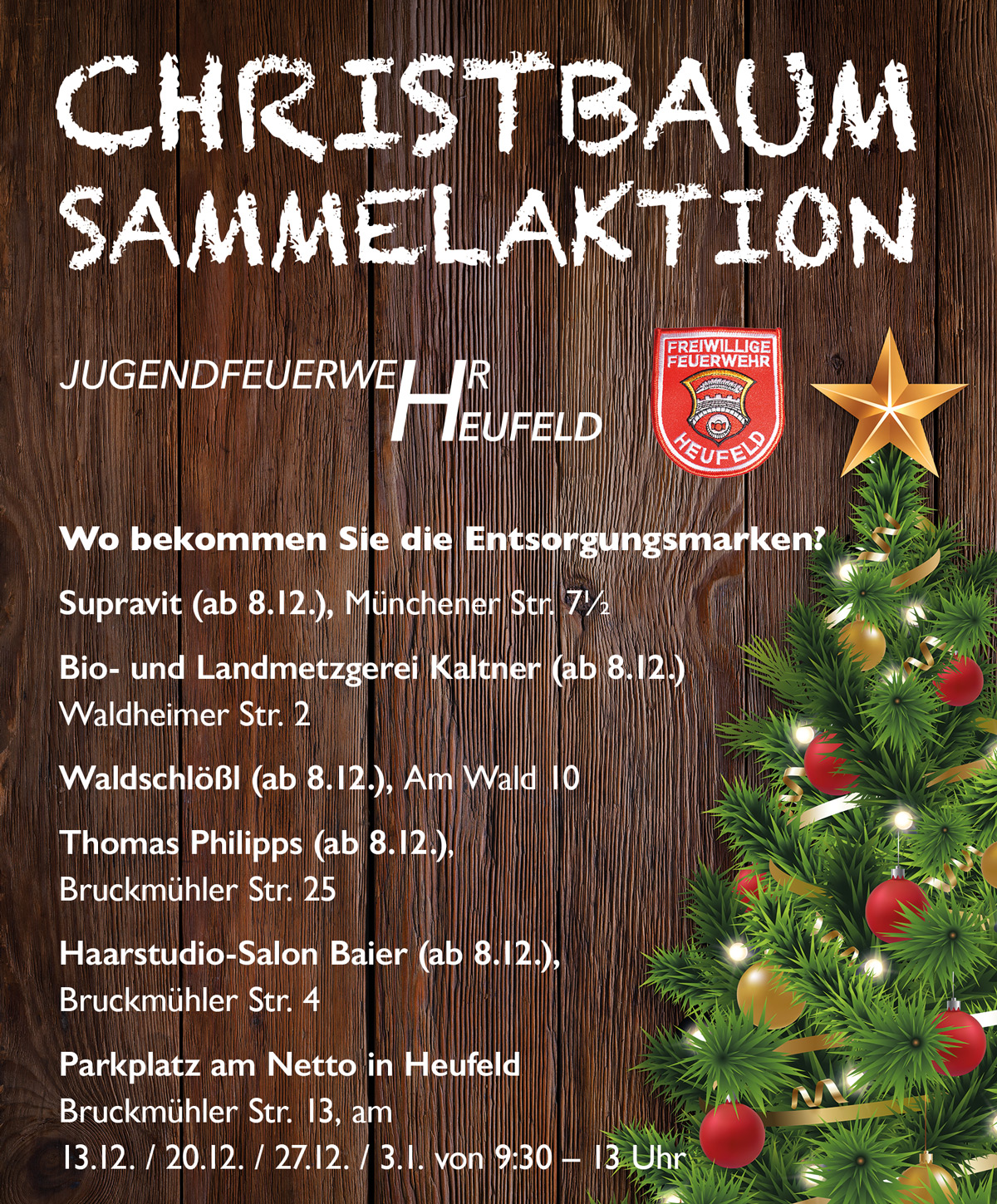 Sie haben einen Christbaum zu entsorgen, aber keinen Anhänger zum Wegfahren? Sie würden sich verständlicherweise die Arbeit gerne sparen, den Christbaum mit Gartenschere und Bügelsäge bis zur Transportgröße für Ihren eigenen PKW zu zerkleinern und das Auto dann auch noch von seinen Nadeln zu reinigen? Dann sind Sie sie bei uns, der Jugendfeuerwehr Heufeld, genau richtig!