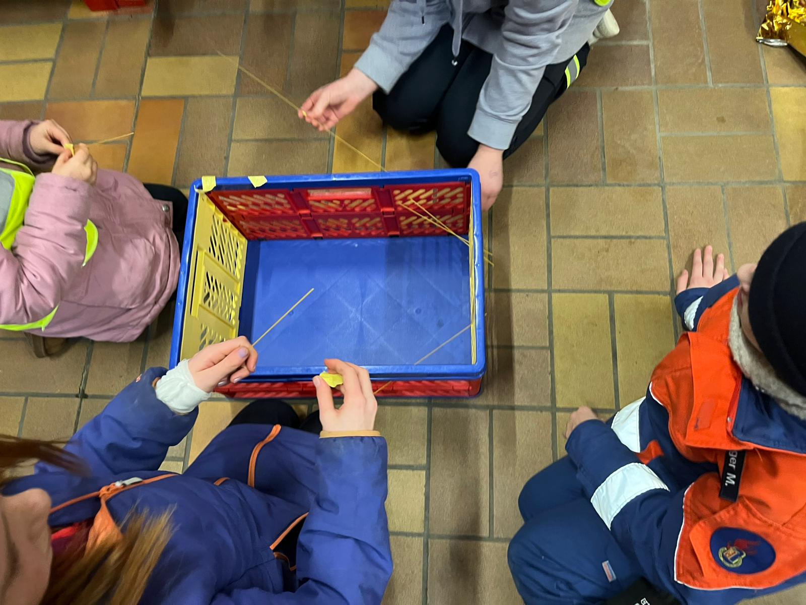 Heute ging es nach den „viel zu kurzen“ Weihnachtsferien wieder in eine neues Jahr Kinderfeuerwehr. Um wieder mit den Gerätschaften warm zu werden, gab es zunächst ein kleines Ratespiel, in dem Armaturen, Strahlrohre etc. erfühlt und anschließend im Zuge eines kreativen Problemlösens zu wahren Kunstwerken verbaut wurden. Einen kleinen Zwischenschritt im Sinne einer „Skizze“ gab es aber noch: im Team wurde zunächst ein Spaghetti-Turm gebaut, der über diverse Hindernisse transportiert und neben seiner künstlerischen Konzeption auf Stabilität getestet werden musste.
